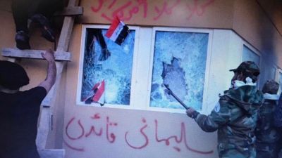 وانتشرت في مواقع التواصل الاجتماعي صور تظهر أحد جدران مقر السفارة الأمريكية والذي كتب عليه: "كلا كلا أمريكا" و"قاسم سليماني قائدنا".