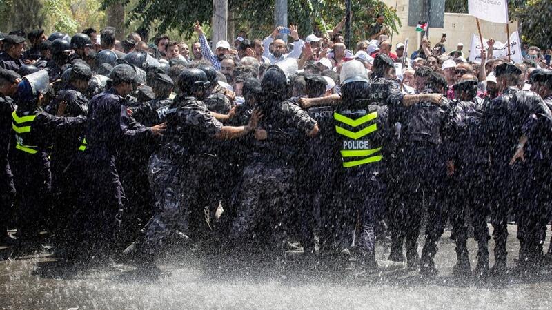 جانب من المواجهات بين المعلمين المحتجين وقوات الشرطة في عمان الجمعة