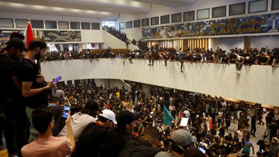 من جهته أعلن رئيس مجلس النواب العراقي محمد الحلبوسي في بيان السبت "تعليق عقد جلسات مجلس النواب حتى إشعار آخر"، داعيا "القائد العام للقوات المسلحة إلى اتخاذ التدابير اللازمة لحماية المؤسسات، وحماية المتظاهرين، الذين أدعوهم إلى الحفاظ على سلميَّتهم وحفظ ممتلكات الدولة".