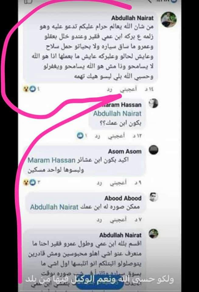 في صورة لنص محادثة على وسائل التواصل الاجتماعي يقول متحدث رئيسي ان الضحية هو ابن عمه ، وهو غير سوي عقليا ( ع البركة وفق تعبير بلاد الشام) ولم يقد سيارة او يحمل مسدسا في حياته ، وقال انه مسكين وعائلته لم تكن قادرة على التواصل معه، واضاف ان افراد اسرته في السجن