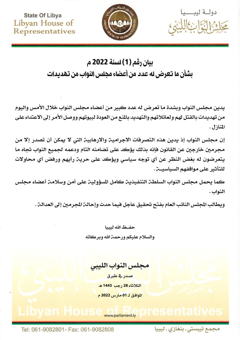دان مجلس النواب الليبي الثلاثاء، تعرض عدد من أعضائه وعائلاتهم لتهديدات بالقتل، وذلك قبيل تصويت مرتقب على منح الثقة لحكومة فتحي باشاغا، التي ستخلف حكومة عبد الحميد الدبيبة.
