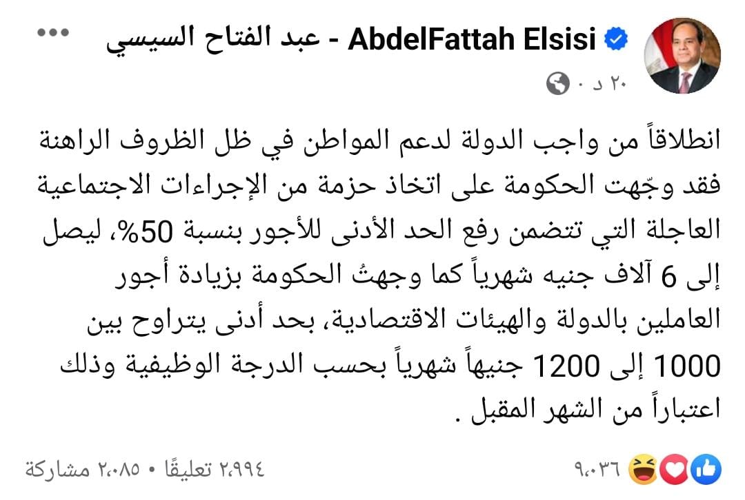 وقال السيسي في منشور عبر صفحته الرسمية على " فيسبوك" :"انطلاقاً من واجب الدولة لدعم المواطن في ظل الظروف الراهنة، فقد وجّهت الحكومة على اتخاذ حزمة من الإجراءات الاجتماعية العاجلة التي تتضمن رفع الحد الأدنى للأجور بنسبة 50%، ليصل إلى 6 آلاف جنيه شهرياً.