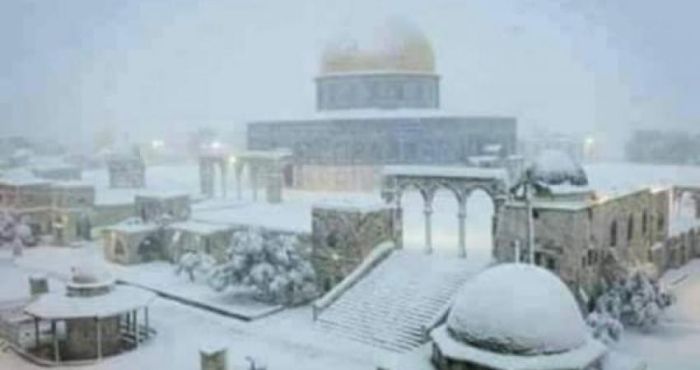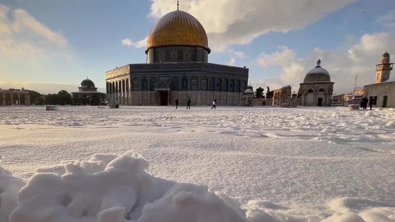 وتدفق فلسطينيون إلى المسجد الأقصى لالتقاط صور تذكارية، في ساحاته المغطاة بالثلج، فيما أغلقت المدارس أبوابها، وتوقفت حركة المواصلات العامة، بين الأحياء، في المدينة.