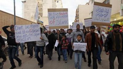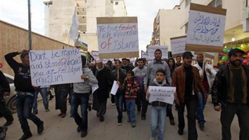 ليبيون يحملون لافتات تطالب بتطبيق الشريعة الاسلامية واعلان الاسلام دين الدولة