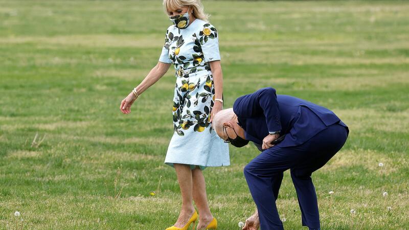 President Biden picks a dandelion for first lady Jill Biden while walking to Marine One as they depart for Atlanta to promote his plans to rebuild the US economy and mark his 100th day in office.