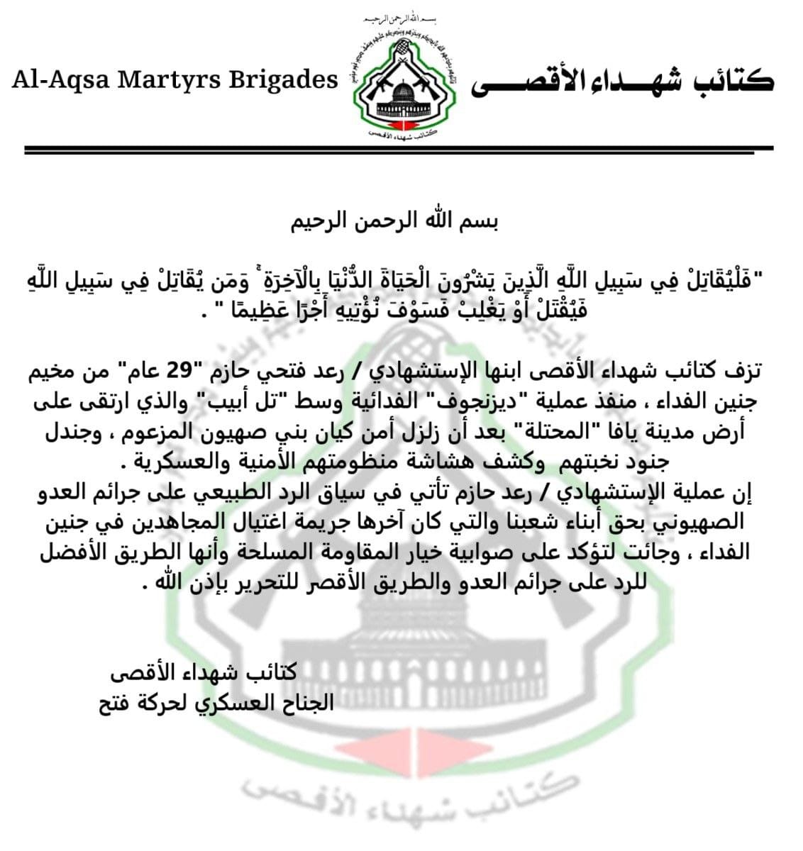 نعت كتائب شهداء الاقصى الشهيد رعد فتحي حازم منفذ عملية تل ابيب الذي استشهد فجر اليوم الجمعة بعد اشتباك مسلح مع قوة إسرائيلية في مدينة يافا.