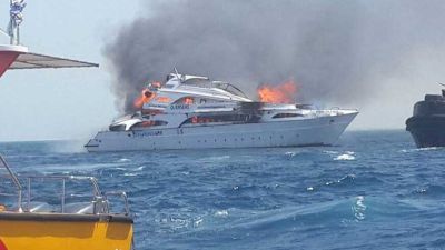 اندلع حريق كبير على متن مركب سياحي يُدعى "هيركن" في مدينة مرسى علم بمحافظة البحر الأحمر، حيث كان على متنه 29 شخصًا.