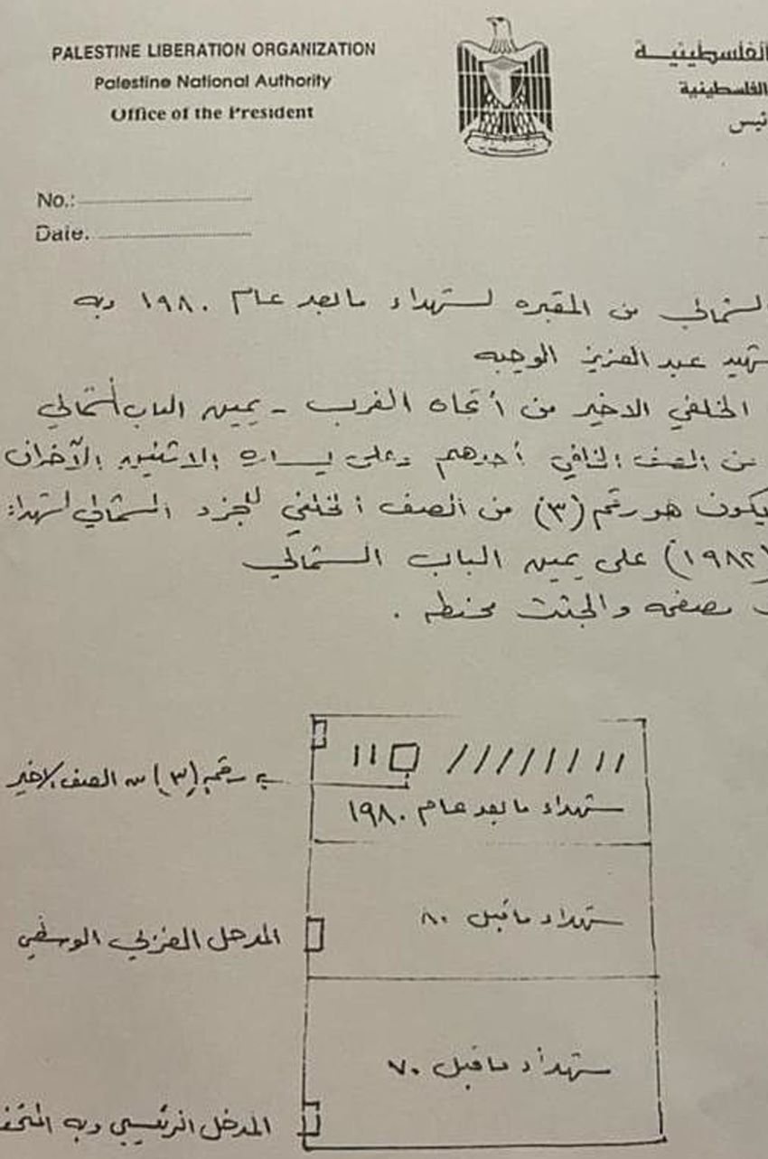 ذكر كاتب الوثيقة أنه من أجل تحديد أن هذه هي بالفعل المنطقة الصحيحة في المقبرة ، يجب على المرء أن يجد قبر شهيد يدعى عبد العزيز الوجيه (عضو سابق في منظمة التحرير الفلسطينية) الذي دفن في نفس المكان.