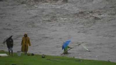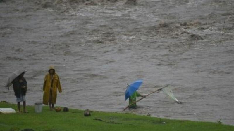 فيليبينون ينتشلون أغراضا من نهر قرب البركان مايون