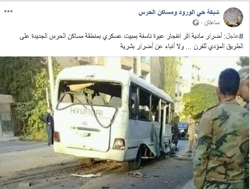 وذكرت مصادر أهلية في منطقة مساكن الحرس (العرين) في قدسيا أن انفجارا استهدف حافلة تقل أفرادا من الجيش السوري.