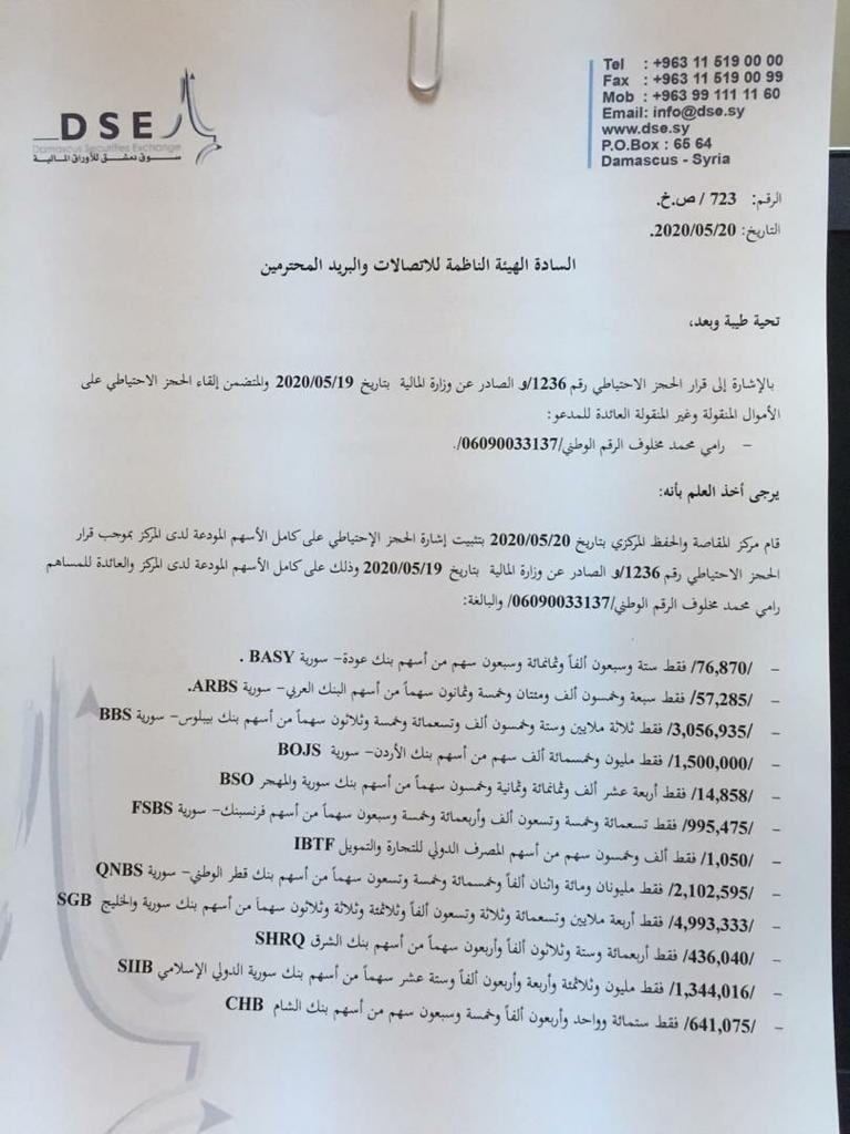 وكان عدد من الصفحات تناقل وثيقة تشير إلى حصص مخلوف وأسهمه في عدد كبير من المصارف وشركات التأمين.