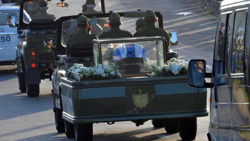 تحرك الموكب صباح الاربعاء من امام وزارة القوات المسلحة في هافانا بحضور اعضاء الحكومة وشخصيات في الحزب الشيوعي وارملة الزعيم الكوبي داليا سوتو ديل فالي.