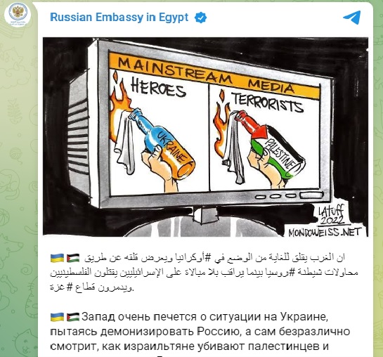 وقالت السفارة في بيان على وسائل التواصل الاجتماعي: "إن الغرب يقلق للغاية من الوضع في أوكرانيا ويعرض قلقه عن طريق محاولات شيطنة روسيا، بينما يراقب بلا مبالاة الإسرائيليين وهم يقتلون الفلسطينيين ويدمرون قطاع غزة".