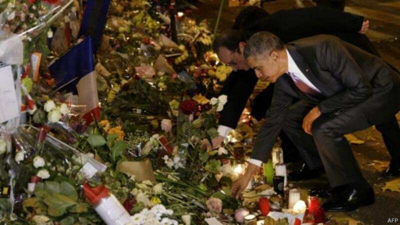 وأسجى أوباما وردة بيضاء في موقع الهجمات الذي قتل فيه 90 شخصا، والذي وصل إليه بمصاحبة الرئيس الفرنسي فرانسوا هولاند وعمدة باريس آن إيدالغو. وشددت الإجراءات الأمنية في العاصمة الفرنسية بمناسبة المؤتمر الذي تنظمه الأمم المتحدة، وأغلقت بعض الطرقات بينما شوهدت مروحيات عسكرية تحلق في الأجواء.