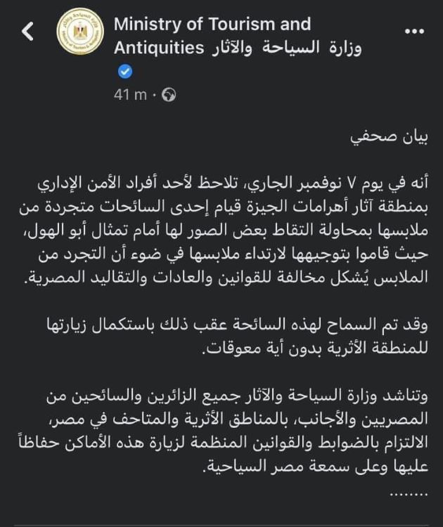 واضاف البيان ان رجل الأمن قام بتوجيه السائحة "لارتداء ملابسها في ضوء أن التجرد من الملابس يُشكل مخالفة للقوانين والعادات والتقاليد المصرية".