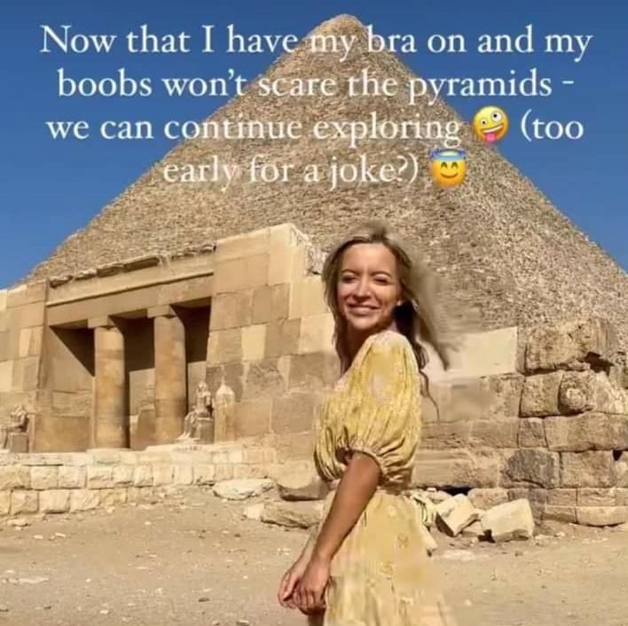 وفي منشور اخر قالت آغي ساخرة "الان، وبعد ان ارتديت حمالة الصدر، ولم يعد ثدياي يخيفان الاهرامات، اصبح بمقدورنا مواصلة الاستكشاف"، مضيفة ان "الوقت لا يزال مبكرا على القاء النكات".