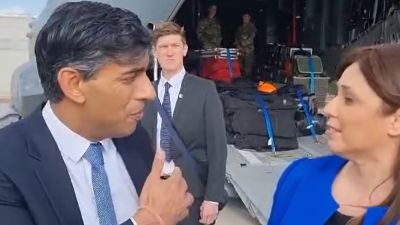 وشوهد سوناك وهو يخرج من البوابة الخلفية للطائرة شاقا طريقه بين صناديق العتاد والذخيرة والجنود البريطانيين الذين وقفوا وعلى وجوههم نظرات الدهشة والاستغراب.