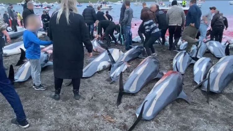 واظهر تسجيل فيديو نشره نشطاء في جمعية رعاة البحر على وسائل التواصل مئات من الدلافين المذبوحة مسجاة على خط شاطئ الجزيرة واخرى راحت تتخبط في مياه الشاطئ الضحلة بينما رجال يصارعون لتقييد حركتها.
