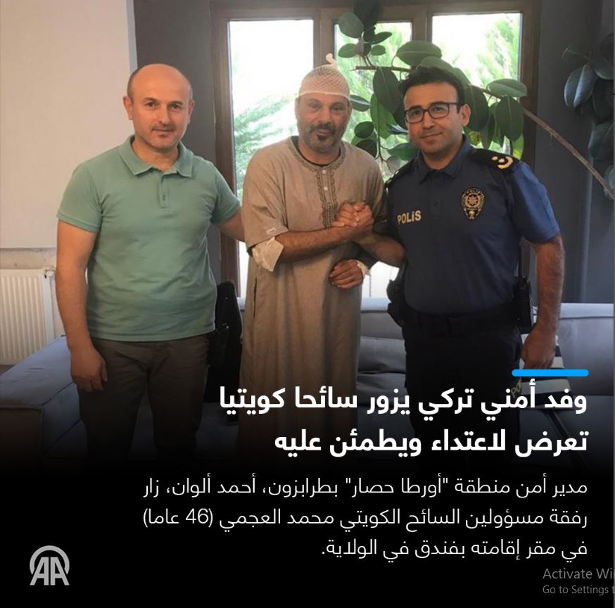 وقالت الوكالة عبر صفحتها على موقع التواصل الاجتماعي انسغرام ان "وفد أمني تركي يزور سائحا كويتيا تعرض لاعتداء ويطمئن عليه بمقر إقامته في فندق بولاية #طرابزون"