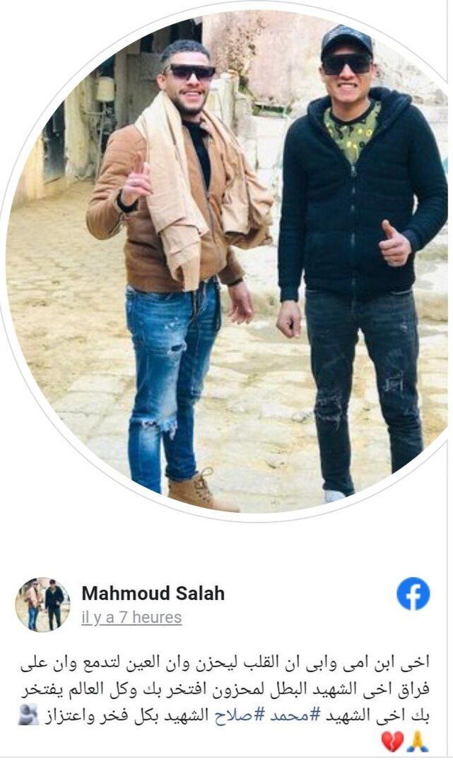ونشر محمود شقيق محمد صورة تجمعهما وكتب معلقا : "أخي ابن أمي وأبي.. إن القلب ليحزن وإن العين لتدمع وإنا على فراق أخي الشهيد البطل لمحزونون". وأضاف: "أفتخر بك وكل العالم يفتخر بك أخي الشهيد محمد صلاح الشهيد بكل فخر واعتزاز".