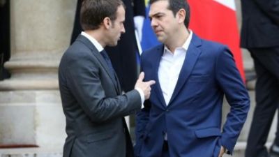 رئيس وزراء اليونان اليكسيس تسيبراس (يمين) يتحدث إلى الرئيس الفرنسي ايمانويل ماكرون قبل مغادرته قصر الإليزيه في باريس