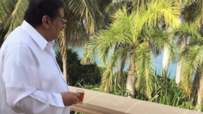ويظهر محمد بن نايف مطلا من شرفة إحدى القصور على البحر، وبيده كوبا من الشاي.
