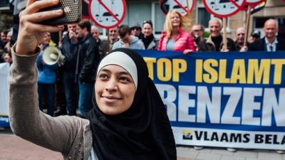 تداول النشطاء على مواقع التواصل الاجتماعي صور فتاة بلجيكية مسلمة تبلغ 22 عاما، قامت بالتقاط صور سيلفي أمام مناصرين لليمين المتطرف خلال مظاهرة لهم مناهضة للإسلام بأنفرس البلجيكية.