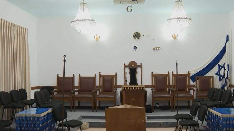 علم إسرائيل وصورة ما يعرف بهيكل سليمان لم تكن غائبة عن المكان بالإضافة إلى قلادة تحمل الشمعدان وألواح الوصايا العشر في اليهودية.