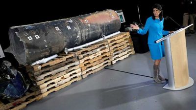 وفي مؤتمر صحافي في واشنطن، اكدت هايلي ان الصاروخ الذي اطلقه المتمردون الحوثيون من اليمن على السعودية الشهر الفائت "صنع في ايران قبل ان يتم ارساله الى المتمردين الحوثيين في اليمن. ومن هناك اطلق على مطار مدني حيث كان يمكن ان يسفر عن مقتل مئات المدنيين الابرياء في السعودية".