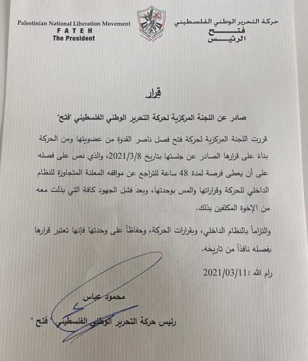 وقال بيان صادر عن اللجنة المركزية للحركة، حمل توقيع عباس إن قرار الفصل يأتي بعد انتهاء مهلة تم منحها للقدوة، يوم الإثنين الماضي، مدتها 48 ساعة، للتراجع عن مواقفه المعلنة "المتجاوزة للنظام الداخلي للحركة وقراراتها والمس بوحدتها".