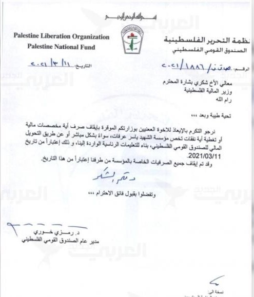 وأبرز القدوة، وثيقة موقعة من مدير عام الصندوق القومي الفلسطيني، رمزي خوري، حول وقف الدعم، قائلا إنها "لم تصله مباشرة وإنما استخرجها من الإنترنت".