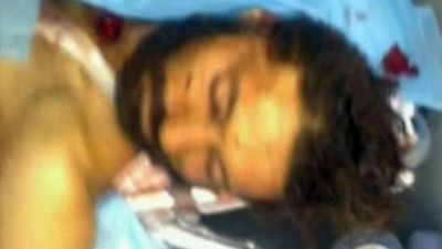 وظهر القذافي وهو يتعرض للدفع والضرب بيد مجموعة مقاتلين وبدا انه يقاومهم في مرحلة ما. وكانت الدماء تغطي وجهه وجرى جذبه الى سيارة بينما ضرب على راسه بمسدس. وقالت الجزيرة ان الصور اذاعها التلفزيون الليبي.