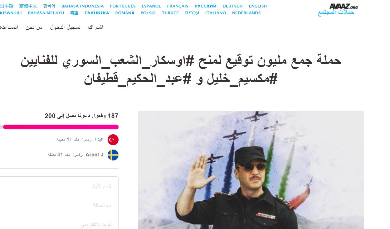 بدا ناشطون على موقع حملات المجتمع افاز Avaaz.org لجمع مليون توقيع في اطار حملة لمنح جائزة الاوسكار الى الفنان السوري المعارض مكسيم خليل وزميله عبدالحكيم قطيفان