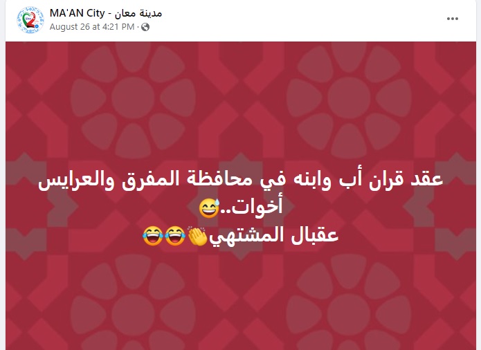 وكتبت صفحة "المفرق نيوز" في منشور عبر صفحتها في موقع فيسبوك تؤكد فيه "عقد قران أب وابنه في محافظة المفرق" مضيفة ان "العرايس أخوات"