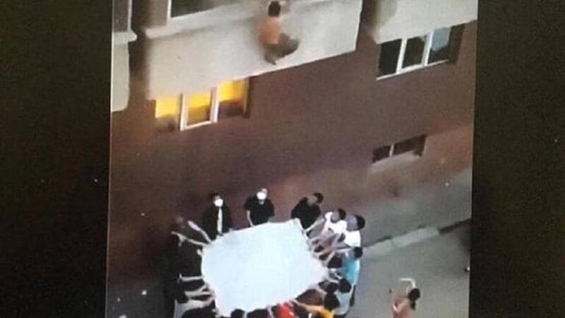 وتمكن الجيران من إنقاذ الرجل عن طريق بطانية كبيرة، حيث تجمعوا أسفل النافذة وبسطوها ليقفز عليها الرجل العالق بسلام، بعد أن أزاحوا سيارة متوقفة في الموقع ذاته.