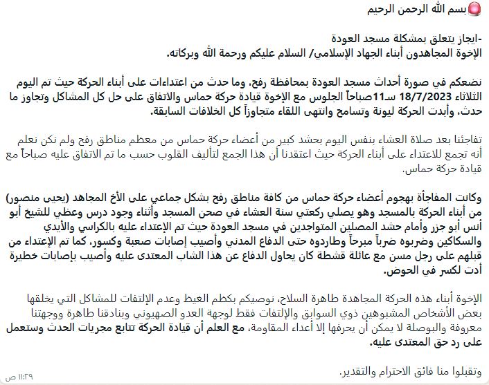 وقالت حركة الجهاد الاسلامي في بيان حمل عنوان "ايجاز يتعلق بمشكلة مسجد العودة": أنّ قيادة حركتا حماس والجهاد جلسوا لحل المشاكل وتجاوز ما حدث في مسجد العودة. وبعد صلاة العشاء تفاجأنا بحشد كبير من عناصر حماس المقيمين في منطقة رفح حيث تجمعو واعتدو على المسجد وأبناء الحركة، علما ان الجهاد اتفقت مع حماس على تجميع عناصرها لـ "لتأليف القلوب" وليس للاعتداء على المسجد وعناصر حركة الجهاد