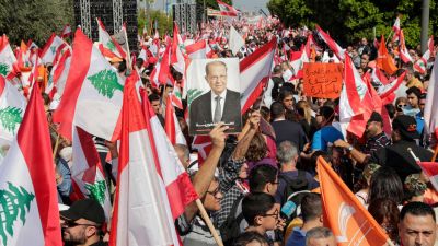 وقالت ديانا (40 عاما) التي تشارك في التظاهرة "نحن اليوم هنا لنثبت للجميع أننا نثق بالجنرال عون وهو فوق كل الشبهات، هو رجل إصلاحي وصادق ويداه غير ملوثتين لا بفساد ولا بسرقة". واضافت "نحن هنا لنقول له إننا معك ومهما حصل سنبقى معك".