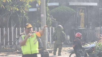 وقال الناطق باسم شرطة شرق جاوا فرانس بارونغ مانغيرا إن كاميرات المراقبة اظهرت دراجة نارية على متنها رجل وامرأة وهي تتوقف عند نقطة تفتيش للشرطة، مضيفا “عند هذه اللحظة وقع الانفجار”.