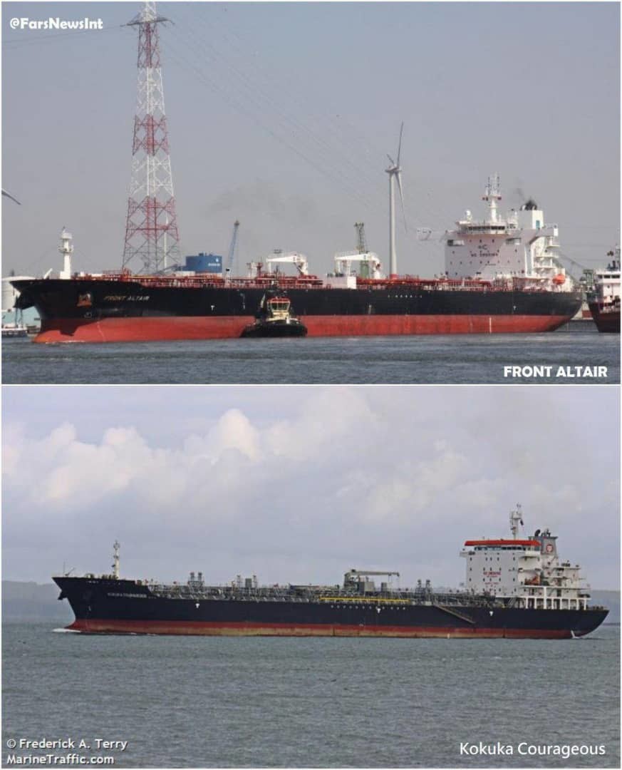 ونشرت وكالة فارس صورا للناقلتين، مضيفة أن إحدى الناقلتين (FRONT ALTAIR) تتبع جزر مارشال والناقلة الأخرى (Kokuka Courageous) ترفع علم باناما.