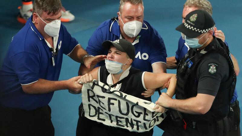 فتاة مناصرة للاجئين تقتحم مباراة نهائي أستراليا للتنس (فيديو)