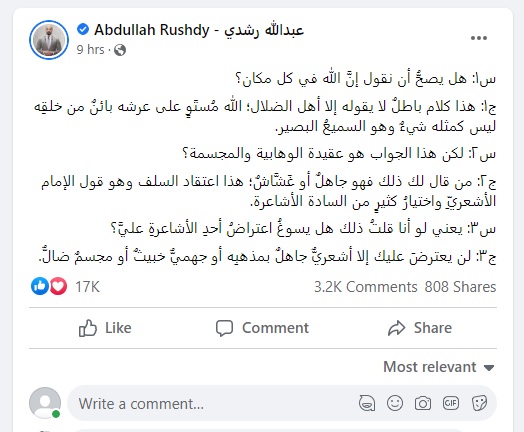ولا يزال رشدي يواصل الى الان هذا النهج، حتى أنه كتب بالتزامن مع إعلان جيهان تسجيل بلاغ ضده لدى النيابة، منشورا في صفحته عبر فيسبوك يتضمن أسئلة فقهية معقدة طرحها على نفسه ثم راح يجيب عنها.