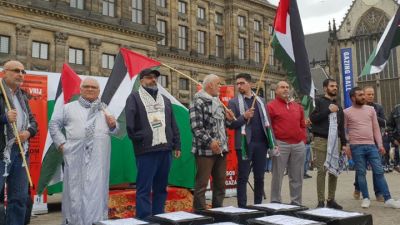 ورفع المتظاهرون من أبناء الجالية الفلسطينية والمتضامنين الهولنديين الأعلام الفلسطينية، وصورا لشهداء مسيرة العودة الكبرى في قطاع غزة.