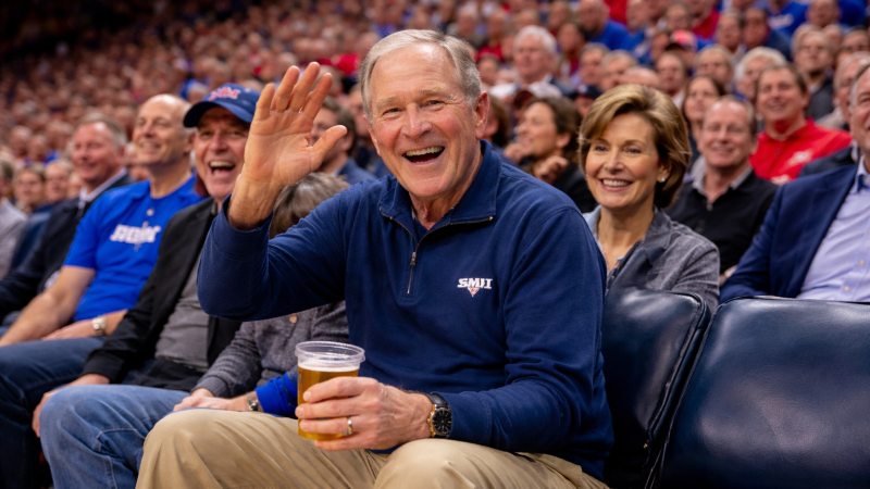 ظهر الرئيس الأمريكي الأسبق جورج دبليو بوش في قاعة “مودي كوليستون” لمتابعة مباراة كرة السلة الجامعية بين فريقي نوتردام و"إس إم يو"، حيث بدا مستمتعًا بأجواء اللقاء إلى جانب عدد من الشخصيات العامة والجماهير.