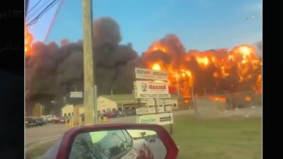 3. عند ارتطامها بالأرض، اندلعت النيران في عدة مبانٍ صناعية خلف المدرج، وتصاعد دخان أسود كثيف في سماء المدينة.طاا