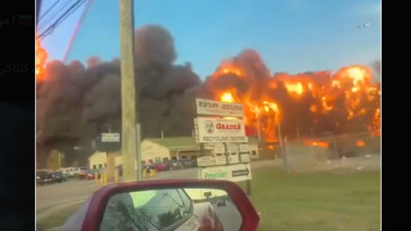 2. التقطت قناة WLKY التابعة لشبكة CBS لقطات للطائرة وهي تقلع والنيران مشتعلة في أحد جناحيها.
