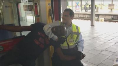 الرجل تمسك بقوة بعمود داخل القطار، إلى أن أحكم المفتشان قبضتهما على رقبته ودفعاه على الأرض. وقد صورت الفيديو ناتاليا ميليتيتش. ونشر عبر فيس بوك.
