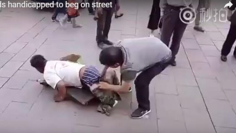 ففي لحظة غير متوقعة، انقض أحد المارة الرجال على متسول يزحف على بطنه مستعينا بلوح تزلج، وقام الرجل بنزع سروال المتسول وسط الشارع، لتظهر ساقاه كاملتين ولكنهما مربوطتين تحت ملابسه ليظهر أنهما مبتورتان ويسهل عليه خداع ضحاياه لاستجداء عطف الناس وكسب المال.