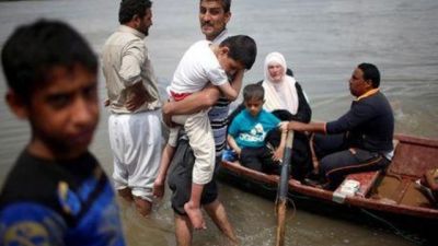 ويغادر الكثير ضاحية مشيرفة في غرب الموصل بعد أن سيطرت القوات العراقية المدعومة من الولايات المتحدة عليها من يد الدولة الإسلامية يوم الجمعة على أمل الوصول لبر أمان نسبي على الضفة الشرقية للنهر.
