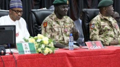 الرئيس النيجيري محمد بخاري (يسار) مع قائد الجيش توكور يوسف بوراتاي خلال افتتاح مؤتمر الجيش السنوي