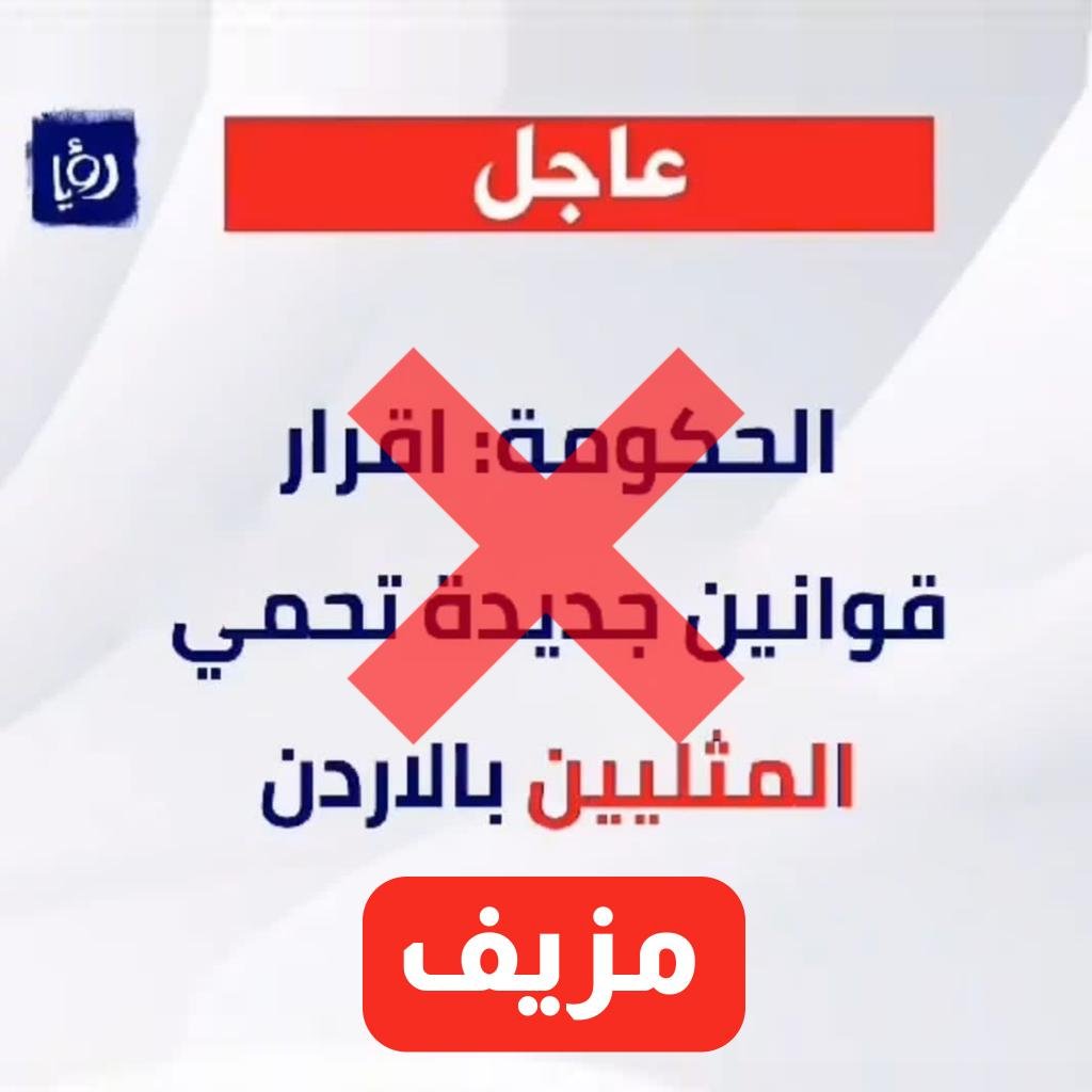 سارعت قناة رؤيا الفضائية المحلية الاردنية واسعة الانتشار الى نفي معلومات وصور متناقلة على وسائل التواصل الاجتماعي تتعلق بنقلها تصريحات على لسان رئيس الحكومة بشر الخصاونة يتحدث عن المثليين